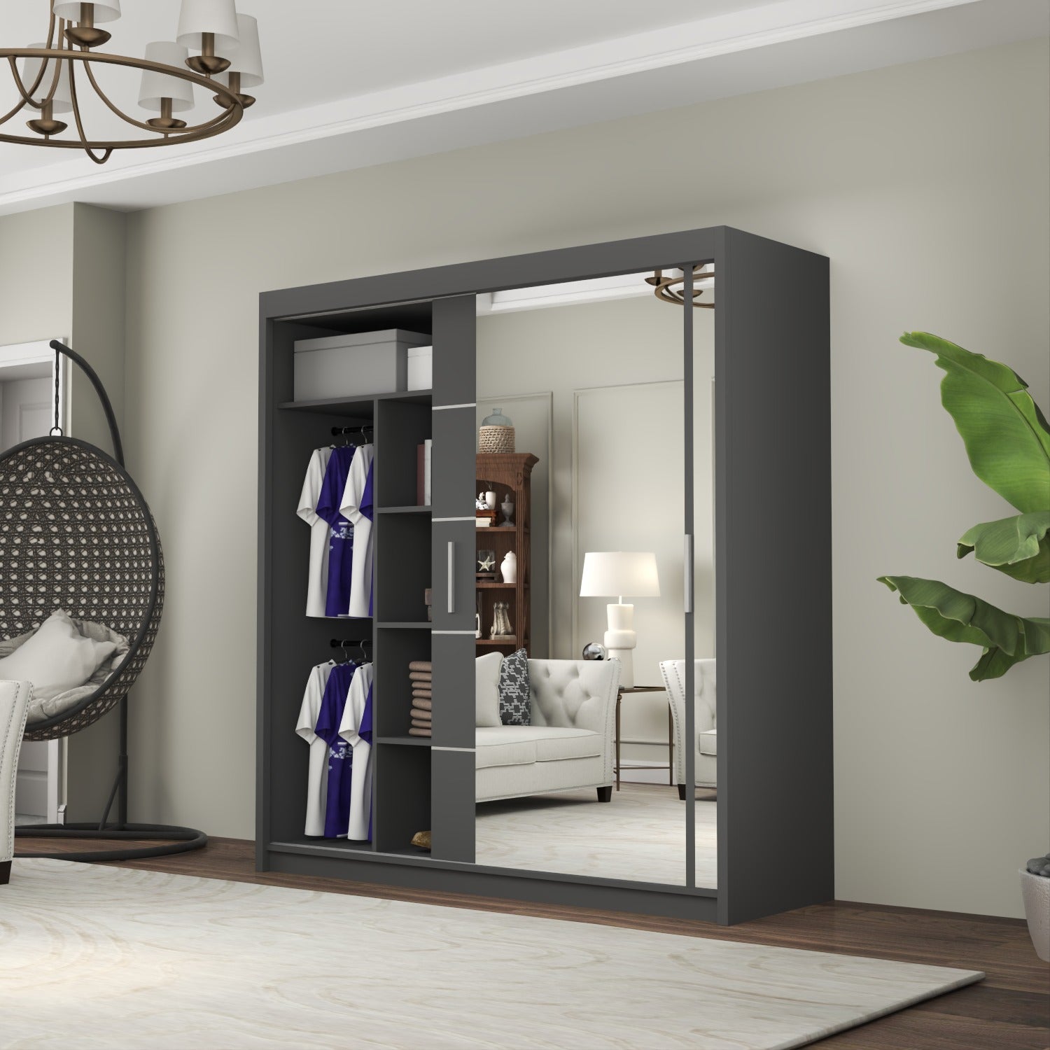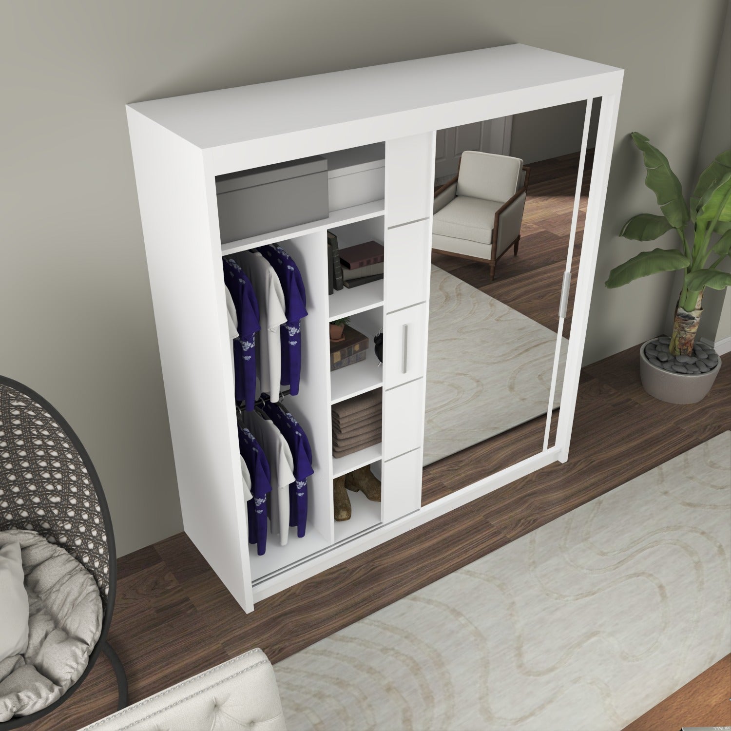 Inside, you’ll find ample room to organize your belongings. Each size offers a practical layout of shelves and a hanging rail, giving you flexibility to arrange your clothing and accessories with ease.